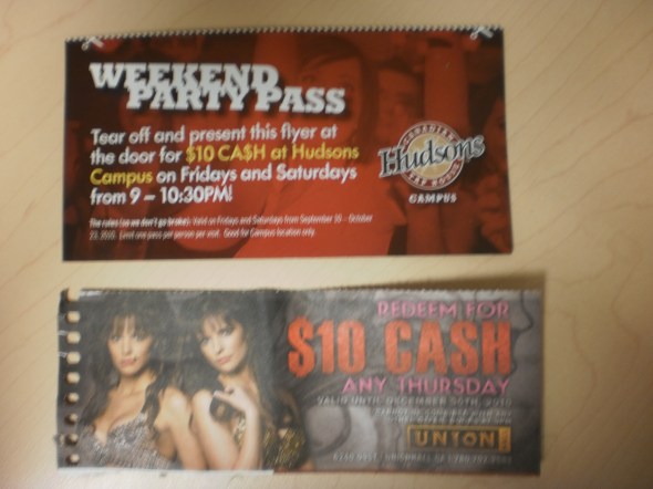 Now this is new — Coupons that you redeem for CASH at clubs… there are two that I’ve seen in Edmonton and its insane that they give you money at the door, Hudsons is a 10min walk from my room and I can get 10 bucks every tues, fri and sat. Its $30 a week that I