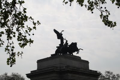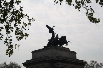 Anyway, we started out in Hyde Park Corner, where we heard about Arthur Wellesley, first Duke of Wellington, apparently an arrogant, elitist, sexist war hero. His mansion was right across from the park (at the awesome address of ‘1 London’) and he had a mounted statue of himself erected there, reportedly so he could see it from his windows whenever he wanted. This not being enough, he built his own Arc de Triomphe in the park as well, after he defeated Napoleon, with another statue of himself on top. Apparently Queen Victoria hated the statue so much she replaced it with another one as soon as he died.