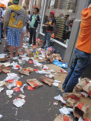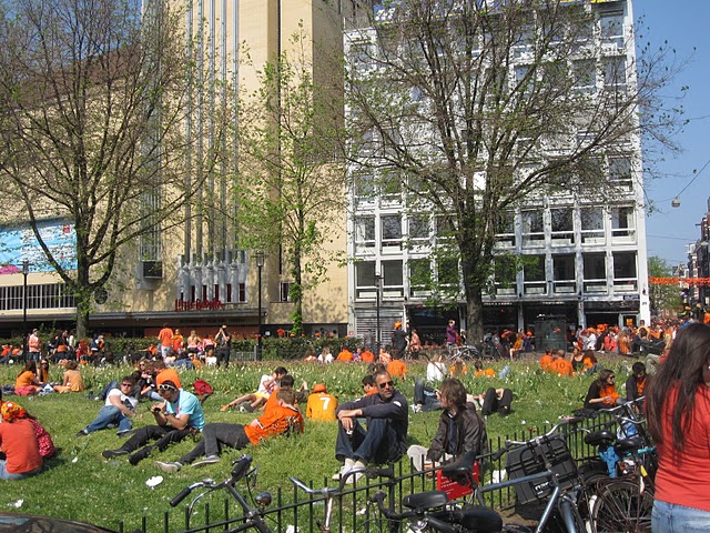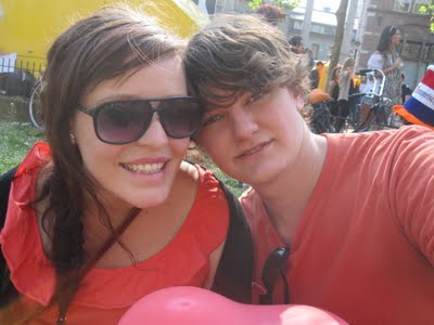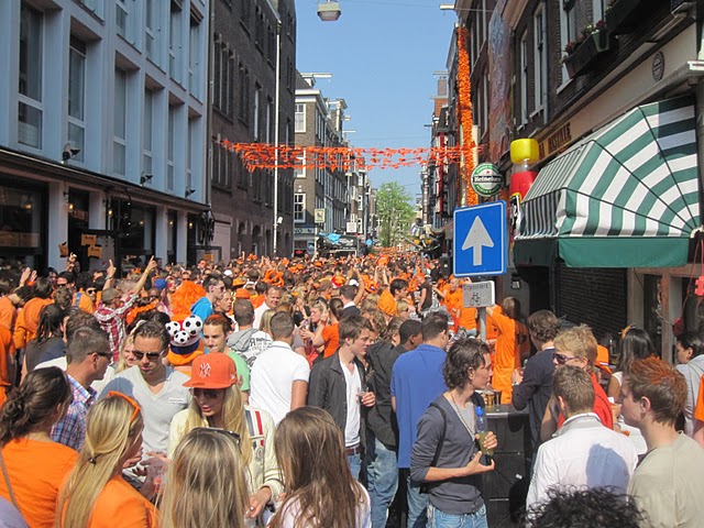 And it turns out I was being ironic when I included the lyric ‘nothing’s gonna colour me’, because something did colour us. That colour was orange, and that something was QUEEN’S DAY! Queen’s Day is like the Netherlands’ Australia Day, except instead of laconic barbeques, picnics, beach expeditions and Sam Kekovich ads, they have a MASSIVE street party in honour of their royal family, the house of (ta da!) Orange. Wearing orange is a requisite of Queen’s Day celebrations. The entire city turns orange. It’s not a very common colour; I’ve never seen so much in my life!