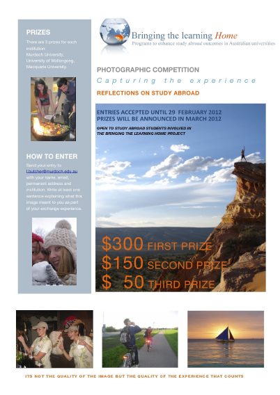 We’re looking for your photographs to capture the study abroad experience: what you’ve learned, crucial experiences, breakthroughs, obstacles, all the lessons and experiences you’ll bring back with you. The contest is open to students from any of the institutions participating in the ‘Bringing the Learning Home’ project.